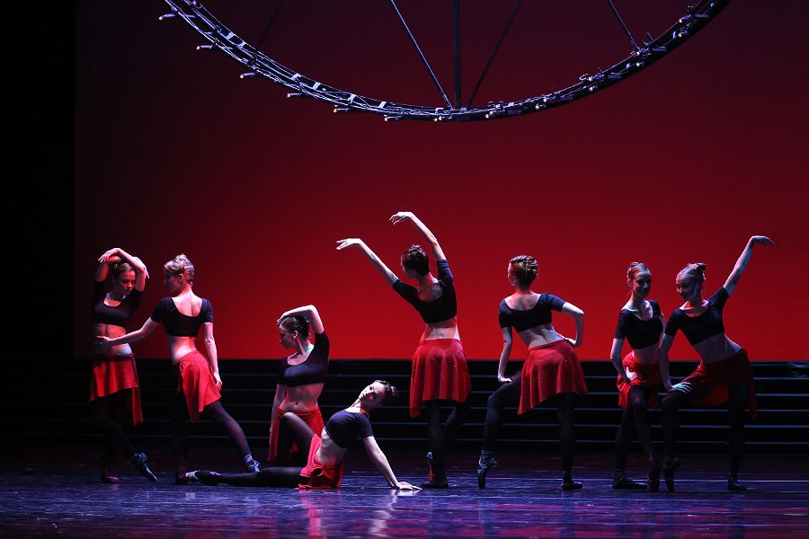 Следуя канону, Ратманский ставит своей Золушке антре, расчищая сцену от персонажей, как и полагается перед выходом балерины. Но на пустой сцене Золушка просто стоит, закрыв лицо руками, затем осторожно ощупывает шагами пространство, то и дело вжимаясь в колонны. В доме мачехи героиня одета в гетры, тунику и теплую кофту — как балерина для утреннего урока. В доме мачехи пространство стиснуто легкими многоярусными металлическими кубами, пересеченными лестницами и рейками. Старинная история неузнанной, не могущей самостоятельно выразить себя красоты (прекрасного лица не разглядеть за сажей, песенку Золушки слышат только кухонные котлы, а душевную отзывчивость путают с услужливостью домашней рабыни) представлена как история стесненности пространством. Пресловутая Золушкина застенчивость (или гордость, как в пьесе Евгения Шварца) выглядит как боязнь пространства. Танец, плотно свитый, почти не сходя с места, напряженно и трудно раскручивается во всю ширину сцены. Так это было в «Среднем дуэте» — микробалете Ратманского на музыку Юрия Ханона. Теперь это происходит в партии Золушки. И так же, как в «Среднем дуэте» за действием наблюдали черный и белый ангелы с громадными мохнатыми серпами крыльев, в «Золушке» наблюдают за героиней разноцветные эльфы времен года. И так же, как в «Поцелуе феи», посланники фантастического мира деловито и невзначай шныряют среди людей, расслаивая реальность, как это бывает в снах.