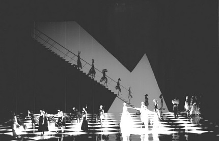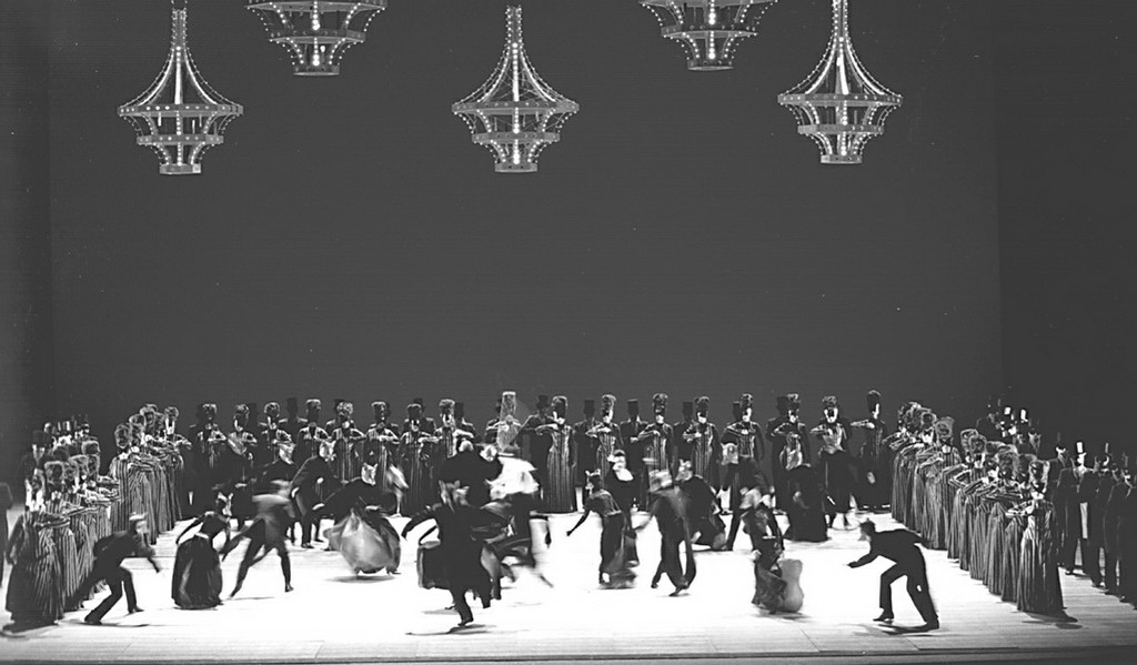 Для нас, приученных к охранительной функции режиссуры при обращении ее к «Онегину», особенно непривычно выглядят массовые сцены. Первая, приход крестьян, опущена. На ларинском балу все дамы одеты одинаково — в фантастические зеленые платья и странные тюрбаны, а часть мужчин — во фрачных костюмах с пронзительно-оранжевыми лисьими масками на лицах. Месье Трике дарит Татьяне огромный розовый бутон, из которого, к восторгу публики, появляется девочка-балерина. Динамизм эпизода ссоры сильно усугублен тем, что «лисы» раскручивают гигантский стол, стремительно перепрыгивая через него. Петербургский же бал открывается грандиозным парадом одетых в ультра-экстравагантные наряды модельерш, которые под музыку полонеза спускаются прямо из-под колосников по подвешенной лестнице, на фоне широченной красной стрелы, и далее автоматическим шагом шествуют по авансцене. Впрочем, и Татьяна, дефилирующая с длинной сигаретой в руке, вопреки утверждениям ее мужа, Гремина, не столь уж сильно отличается от других светских кукол, ибо душа ее, по мысли постановщика, убита Онегиным. Вообще пафос Трелиньского — осуждающий: Онегин олицетворяет разрушительную силу, в первом акте он губит Татьяну, во втором — Ленского, в третьем — себя самого.