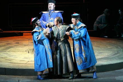 Спектакль был мизансценически схож с тем, что прошел в театре. Отличие — естественное оформление и другие костюмы. Но как раз выборгский вариант показался менее стильным, с явными погрешностями вкуса (режиссер Иркин Габитов, художник Вячеслав Окунев). Турандот пела Лариса Шевченко — качественно и к тому же с мощной драматической энергией. Зато Калаф не удался Юрию Алексееву, можно сказать, от первой до последней ноты.