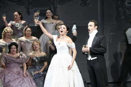 Первый состав солистов: в особенности А.Нетребко (Виолетта) и В.Герелло (Жорж Жермон) демонстрируют первоклассный вокал, а у О.Балашова (Альфред) есть все возможности к ним присоединиться в будущем. А.Нетребко, помимо прочего, создает такой образ Виолетты, рассказ о котором обещает войти в историю театра. Она поразительно органична, полна естественной грации, женственности, очарования. Образ решен неоднозначно — Виолетта ветрена и кокетлива в первые минуты действия, подвержена перепадам настроения в финале первой картины, где удивительно глубоко и тонко проживается, именно проживается, процесс зарождения чувства любви и надежды. Здесь даже фиоритуры и пассажи исполняются не как технический трюк, превращаясь в характеристику образа. Вторая картина — встреча с Жоржем Жермоном — не обманывает ожиданий и вызывает слезы на глазах особенно восприимчивых слушателей. Возглас «О Альфредо» в момент расставания становится драматической кульминацией роли — с ним не сравнится даже прощальная ария последнего действия.