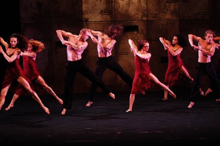 Всякие уточнения, наводняющие либретто, — о техногенной катастрофе и постиндустриальном мире — лишние детали, отвлекающие от главного. В центре сцены — шесть танцовщиц в платьях винного цвета. Сбившись в кучку, они невнятно топчутся в центре, почти болезненно контрастируя с первыми музыкальными фразами, еще не предсказывающими сурового ритуального ритма. Но вместе с ударными, сметающими безмятежность первых весенних разливов, на сцене появляются шесть мужчин, чтобы волной набежать на бордовую группку и разбиться об нее волной. Невыносимый пафос слов, описывающих «таинства любви и мистический ужас бытия», в танце трансформируется в жесткий язык маленьких резких прыжков, жестких перегибов корпуса, силовых поддержек. Обадья сталкивает группы и растаскивает их, как сначала срывает платья с танцовщиц, а потом снова заставляет одеваться. Он тратит силы, пересказывая страшные сказки о бездушном мире, из которого нет выхода. Но следишь не за рассказами о «боязни заглянуть в глубины своей собственной души», а за красотой геометрических фигур, расположенных на скобах металлической стены, за энергией тел, покрывающихся слоем песка, за трансформацией хороводов, выбрасывающих из своего круга Избранника и Избранницу.