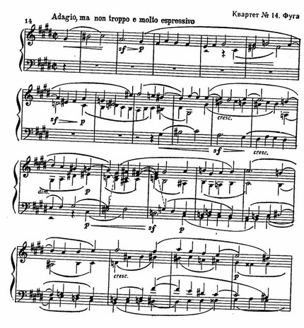Происходят изменения и в области формы. Монументальность и грандиозность замысла, превосходящая все дотоле созданное композитором, сочетается с тончайшей детализацией отдельных страниц. Разрослись и части цикла и весь цикл в целом. Так, масштабы вариаций из последней сонаты, фуги из сонаты ор. 106 не имеют себе равных в фортепианной литературе. В квартете ор. 131 семь частей. Первая – Adagio – фуга, построенная на типичном для позднего Бетховена интонационном материале: