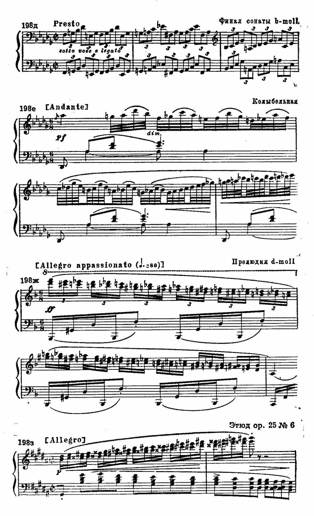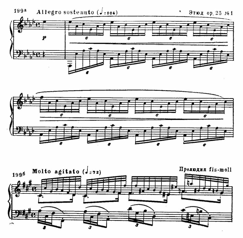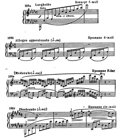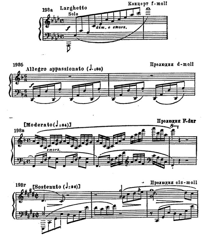 С другой стороны, воздушный образ Fis-dur'ной прелюдии достигается только при помощи педального фона и особого сочетания пианистических регистров. Сама тема предельно проста, гармонически почти примитивна (пример 198 в).