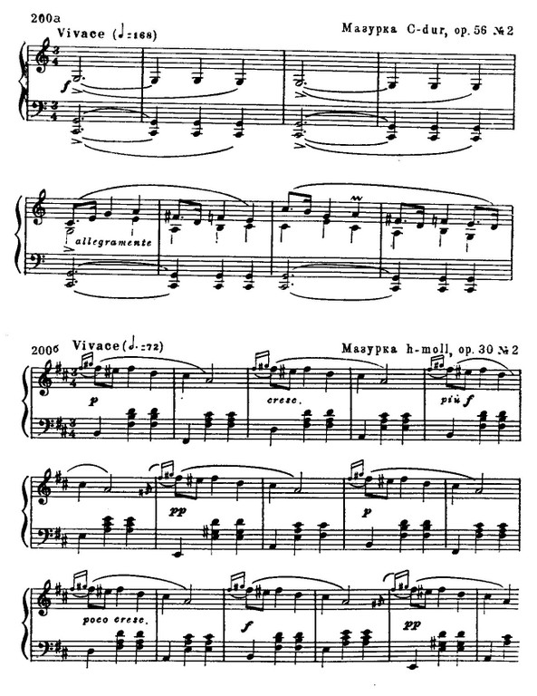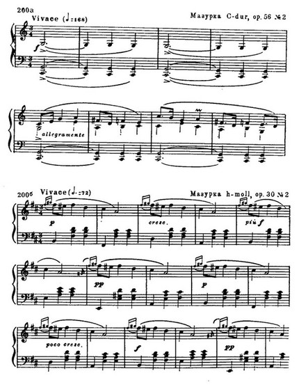 Любопытно, что иногда даже в самой фактуре некоторых шопеновских мазурок, при всей ее пианистичности, слышатся отзвуки инструментальных ансамблей, распространенных в польских деревнях. Так, например, в мазурке С-dur ор. 56 фортепианная фактура воспроизводит звучание волынки и контрабаса; в мазурке h-moll ор. 30 — явное подражание игре деревенского скрипача: