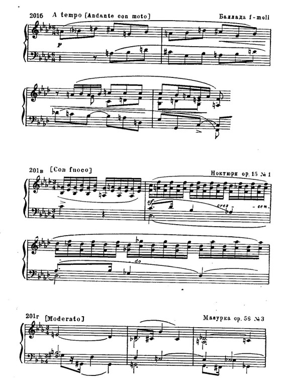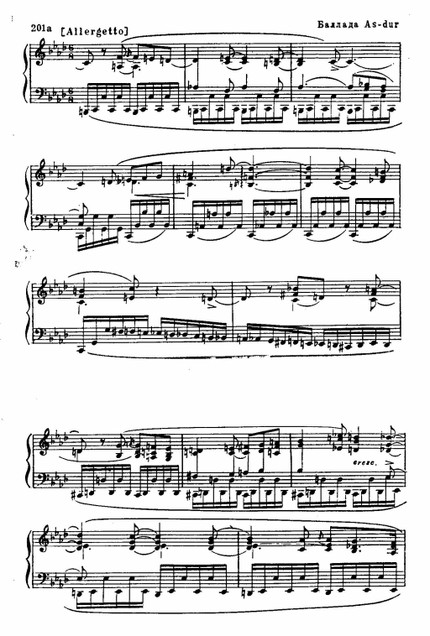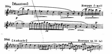 Так, например, замечательный поэтический эффект созерцания, которым завершается медленная часть f-moll'ного концерта, исходит из такого расположения звуков простейшей гармонии, которое именно на фортепиано порождает богатейшие обертонные наслоения (пример 198 а).