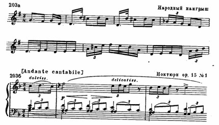 Шопеновский прием перехода кантилены в «арабески» также несомненно уводит к вариантному типу развития, распространенному в народном инструментальном исполнении.