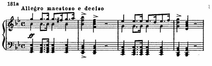 Одна из них продолжает героику «Вильгельма Телля». Постановки опер Беллини в Италии часто сопровождались бурными патриотическими демонстрациями. Зрители усматривали в них актуальный политический смысл, и это немало способствовало их успеху. Так, в «Норме» сквозь мелодраму отчетливо вырисовывается тема восстания угнетенного галльского племени друидов. В «Пуританах» действие развертывается на фоне гражданской борьбы между демократически настроенными пуританами и приверженцами монархии. Подобных патриотических сюжетов было бы достаточно, чтобы воспламенить революционно настроенную итальянскую публику. Однако и музыка опер Беллини отличалась романтической приподнятостью, пафосом. Композитор нашел свои самобытные интонации, соответствующие эмоциональному содержанию героических сцен. Массовые хоровые сцены воинственного характера поданы в его операх в декламационной манере, свойственной итальянским освободительным песням. Маршевые ритмы, острые пунктирные обороты часто придают его музыке суровый, волевой характер. Таковы, например, воинственный хор из третьего действия оперы «Норма», сцена призыва к восстанию и другие: