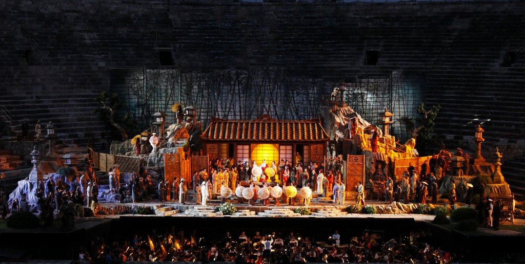 История любимого детища Пуччини в Арене довольно коротка: всего шесть постановок (первая в 1978-ом году) и не слишком большое количество представлений — пятьдесят. Интимная природа «японской трагедии» Пуччини противоречит как грандиозным пространствам шедевра древнеримской архитектуры, так и стилю kolossal, в котором ставит свои спектакли в Арене маститый режиссер, который, кстати, в первый раз обращается к «Баттерфляй» за все годы удивительно длинной карьеры.