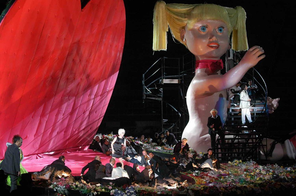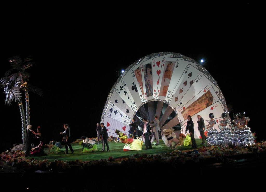 Грэм в союзе с художником Полом Брауном разворачивает действие на огромной огруглой наклонной платформе, которая начинает «играть» с самого первого звука музыки. Платформа завалена искусственными цветами, среди которых горят свечи. Это своеобразный flash back: после смерти Виолетты многочисленные поклонники приходят на ее могилу. Вик переносит действие вердиевской оперы в наши дни (в свое время автор настаивал на современной ему эпохе действия оперы, что цензура ему так и не разрешила: «Травиату» играли в костюмах вocемнадцатого века...). «Кладбище» в начале недвусмысленно отсылает к трагедии семилетней давности, когда читатели «розовых» журналов и поклонники «печальной принцессы» Дианы засыпали цветами ограду Букингемского дворца. Героиня вердиевской оперы представлена в виде «старлетт», ее шумная жизнь — достояние самой широкой публики, «хлеб» для папарацци. Окружение «старлетт» изображено с большой долей гротеска: что стоит присутствие на сцене гиганских размеров куклы с глупыми и наивными голубыми глазами и осветленными перекисью водорода волосами. Вокруг куклы «вьется» лестница, на которой и появляется Виолетта — торжествующая и обожаемая «звезда» таблойдов. Выдумка с лестницей весьма удачна в акустическом отношении: с нее хорошо «летят» в зал арии, в то время расположение хора, одетого в одинаковые черные фраки, по бокам платформы, акустические проблемы создает.