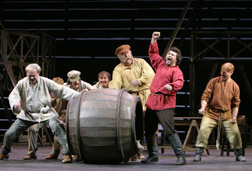 Кстати, к вопросу о взаимоотношениях Чхеидзе с музыкой. Многие мизансцены сделаны им совершенно вразрез с музыкальным темпоритмом и зачастую трудно избавиться от ощущения, что режиссер не вполне адекватно представлял себе характер музыки Шостаковича. Достаточно вспомнить знаменитый симфонический антракт, когда Задрипанный мужичонка бежит в полицию доносить на своих хозяев. Уже предчувствовавший в тогдашней советской атмосфере (опера, напомним, создавалась в самом начале 30-х годов) появление целой когорты таких вот вдохновенных стукачей, композитор дал здесь мощнейшее гротескное обобщение, что, вполне возможно, также поспособствовало грядущему запрету его оперы. Чхеидзе же не придумал ничего лучшего, как поставить на эту музыку пляску (галоп все-таки!) подгулявших горожан. Имеющий уши...
