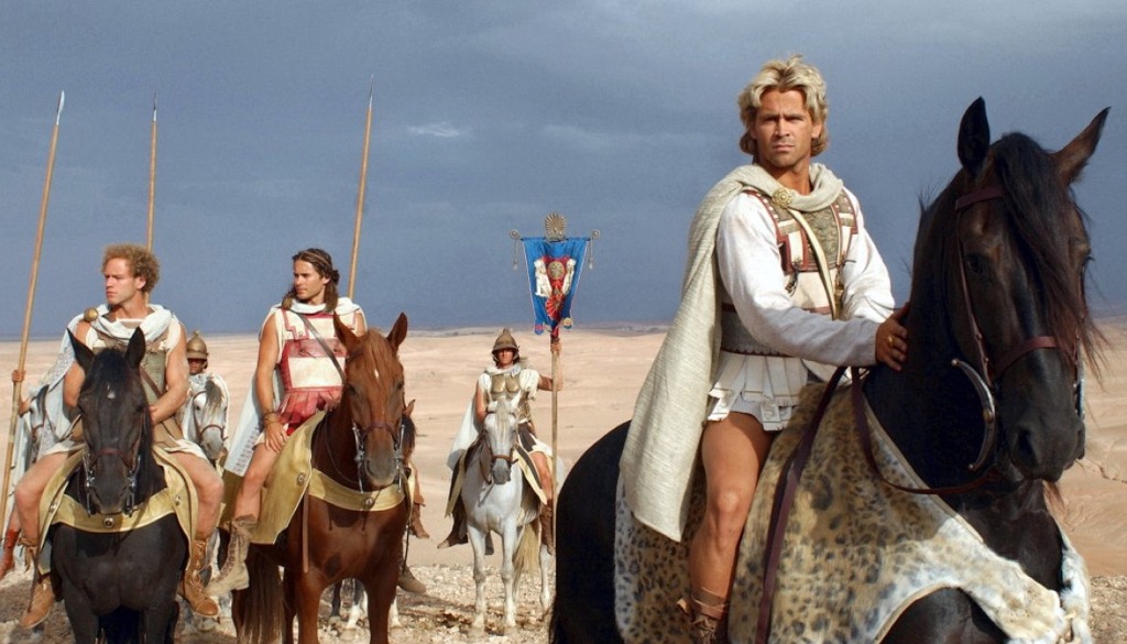 Несмотря на то что подобный ход мыслей представляется всего лишь шуткой, почерпнутой из фельетона, фильм все-таки следует досмотреть до конца, до итоговой речи Птолемея, дабы понять, что именно так и думает Оливер Стоун. Что касается битв и вообще спецэффектов, то разве можно было сомневаться, что они будут не на уровне? Гораздо сложнее с актерами, которые все-таки должны были играть не прототипов для компьютерных игр (что, в частности очень хорошо получается у эффектной Анжелины Джоли). И не напоминать зрителю, пресыщенному модой на пеплумы, куда более «античных» с виду коллег по голливудскому цеху. Похоже, что это уже случай исполнителя заглавной роли Колина Фаррела (ирландца по рождению!), тщательно и нелепо загримированного под Брэда Питта, недавно снявшегося в роли Ахиллеса в «Трое»: собственно, раз уж сам Македонский «строил биографию» с этого героя Троянской войны, то почему режиссеру не делать с актера из «Трои» своего Александра. Все-таки они должны были донести до зрителя хоть толику легендарной харизмы своих героев.