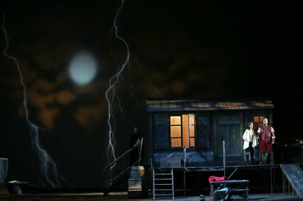 Еще два слова о декорациях. На уровне замысла, повторяю, они вызывают интерес. Великолепна дверь в покоях герцога, опять же, подобно роскошной раме, ограничивающая пространство действия; неплохо смотрится предместье, где Риголетто укрывает свою дочь: на заднем плане высвечивается стена дома, две двери, пять стульев, — еще один признак фламандско-голландских влияний. Но, во-первых (с подобным казусом уже приходилось сталкиваться), опубликованные в буклете копии макета выглядят намного эффектнее собственно сценической версии. Во-вторых, они кажутся самодовлеющими, какими-то безучастными. И наконец, под стать режиссуре, удобными для фотографов, но стилистически невыверенными: в последнем действии вдруг появляется какая-то модернистская конструкция, напоминающая строительный вагончик — жилище Спарафучиле.