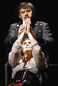 Поповски с блеском вышел из этой ситуации, поставив динамичный, эффектный спектакль, и сумел передать на маленькой сцене Центра атмосферу севильских площадей, полных народа и горных круч испанских Пиренеев. В его версии мизансцены пронизаны музыкой и педантично ей соответствуют. Конечно, Мериме, чья новелла стала основой либретто, написал, что цыганка Кармен сама подошла к Хозе, но если в оркестре в этот момент звучит тема героя, он у Поповски идет первым. Режиссер то заполняет сцену актерами, создавая ощущение людной площади, то переходит с «общего» плана на «крупный», оставляя вдвоем Кармен с Хозе или с Тореодором. На сцене то и дело блестят кинжалы и разыгрываются нешуточные страсти.