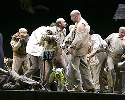 Кроме работ Ларисы Гоголевской и восхитительной Ирины Матаевой в заглавной роли (также номинация на "Маску"), следует отметить еще одну - Лаца в исполнении финна Йормы Сильвасти, введенного в спектакль накануне премьеры. Необыкновенно выразителен его персонаж: трогательный, любящий, чудаковатый, постоянно обиженный и не слишком симпатичный. А его свадьба с Енуфой, где молодые сидят за столом, составленным из накрытых клеенкой чемоданов, и неуклюже кружатся в грустном танце, напоминает еще одну великую оперу первой трети ХХ века - "Леди Макбет Мценского уезда" Шостаковича, где невеселая сцена свадьбы также кончается бедой. Финал "Енуфы", правда, звучит более умиротворяюще - настолько, что в версии Василия Бархатова молодые радостно бьют хрусталь на счастье. И это, пожалуй, самый сомнительный момент и без того не блестящей постановки.