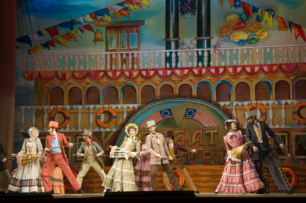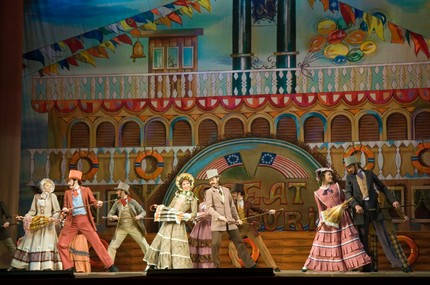 Сценическому остроумию Абушахманов как будто учился у мастеров телеводевиля в стиле «Соломенной шляпки» или «Небесных ласточек». Каждая мизансцена содержит в себе россыпь прелестных деталей, подобных одновременному укусу яблока Томом и Бекки, имитирующему поцелуй, или «вариациям» на кошачью тему в первом акте. Молодая художница Фания Низамова (в ее активе — балеты «Тайна золотого ключика», «Белоснежка и семь гномов») идеально вписалась в постановочный ансамбль, раскрасив сцену так простодушно и безудержно, как будто это ей, а не Тому с друзьями, тетушка Полли поручила привести в чувство поблекший забор. Эдакий американский бэби-стайл с пароходами, котами, воздушными шарами и пафосными портретами президентов в качестве фона для школьных проказ...