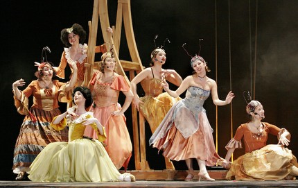 Режиссер же, хотя Юрию Александрову как никому идет этот жанр, отказался от яркой буффонады и, похоже, старался проявить благовоспитанность в оглядке на детскую аудиторию. Балаганных штучек в «Короле-олене» нет, все в меру интеллигентно, спокойно, чинно. Оформление Эмиля Капелюша узнаваемо (с переходом в однообразие приемов). Художник любит «частоколы» на сцене, и артисты возят по сцене «полумесяцы» или карабкаются на них — то ли велосипеды без педалей, то ли такие кресла-лестницы на колесиках. Хореограф Владимир Романовский тоже не стал загружаться и поставил необязательную подтанцовку.