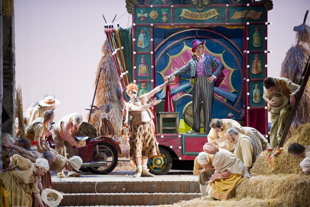 Фабио Спарволи больше известен как режиссер-ассистент, работавший, в частности, с великим Джорджо Стрелером. Поэтому вряд ли стоит удивляться, например, разительному сходству визуального ряда «Напитка» со стрелеровским «Фальстафом», перенесенным несколько лет назад на сцену Большого театра. Легко предположить, что сценограф Мауро Карози получил от режиссера задание сделать что-то в духе работавшего со Стрелером Эцио Фриджерио и вполне с этим справился. Нам показывают на сцене как бы настоящую (на самом деле, конечно, оперную) итальянскую деревню, с настоящими стогами сена и т.д. Сам режиссер практически полностью в этой декорации растворился, не обнаружив своего присутствия и в работе с исполнителями, действующими на подмостках и передвигающимися по ним вполне шаблонно. Впрочем, это отнюдь не самый плохой вариант, поскольку отсутствие явных противоречий и диссонансов с духом и стилем первоисточника по нынешним временам уже само по себе может рассматриваться как достоинство. Если бы сюда еще хоть чуточку больше юмора, без которого комическая опера как рыба без воды...