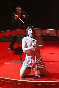Постановка оперы, безусловно, удачна. В том смысле, что она полностью созвучна самому произведению. В абсолютно пустом черном пространстве режиссер А. Титель и художник Э. Гейдебрехт помещают мир отвратительных личностей, нормальность психики которых вызывает большие сомнения. Бессмысленные метания и кривляния героев, циничные взгляды, пошлые жесты – всего этого в спектакле с избытком. Разумеется, король Клавдий заваливает периодически не только королеву Гертруду, но и вообще все движущиеся объекты вне зависимости от их пола. Разумеется, у него проблемы с газообразованием и пищеварением, поэтому он периодически блюет и пукает. Разумеется, что королева, что Офелия – круглые дуры. Разумеется, под юбку возлюбленной Гамлета лезут практически все, не только принц датский. Разумеется, его друзья – таковыми не являются, а являются настоящими подонками. Думаю, от продолжения стоит воздержаться – и так клиническая картина ясна.