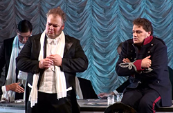 Единая драматическая волна подхватывает вас уже на увертюре, превращенной режиссером в пантомимически выраженный концентрат страстей, которым предстоит бушевать на сцене: жизнь - игорный дом. Эта волна будет нести зрителя через весь огромный спектакль, в котором смешное и карикатурное граничат с глубинным и трагическим. Дирижер Кристиан Бадеа, подобно своему учителю Леонарду Бернстайну, прекрасно ощущает упругость и накал этой музыкальной волны, где нет пауз для передышки, где все движется непрерывно и многослойно, стремясь к неизбежному финалу спектакля и жизни. Этому же подчинена и цветовая гамма спектакля, воплощенная в костюмах и декорациях выдающимся австрийским художником Хартмутом Шергхофером.