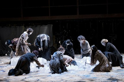 Исполнять Смерть (еще один дебют этого лета — артист из Бремена Бен Бекер) тоже непросто, потому что Штюкль превратил Смерть в трансвестита со всеми особенностями такого образа: обнажены отдельные части тела, слои краски на лице и на волосах, ужимки, ухмылки и прочее. Кроме хорошей физической подготовки, у Бекера отменный голос: его Смерть так громко разговаривает с Имяреком, что стены трясутся. На самом деле нет ничего странного или смешного в том, что Смерть играет мужчина — немецкая смерть (der Tod) мужского рода. В старых постановках Смерть выглядела довольно занудным типом, и только Штюклю пришло в голову не пугать зрителей Смертью, а смешить. Черт и Смерть в его спектакле вызывают гомерический хохот, притом что они не анекдоты травят, а строгий текст Гофмансталя произносят. Все отдано на откуп артистам — любая импровизация с их стороны приветствуется.