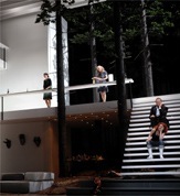 Из того, что Cosi fan tutte без сосен не обойдется, секрета не делали: деревья из прошлогоднего "Дон Жуана" можно было видеть и на рекламных фотографиях спектакля, и на задворках "Дома Моцарта". Однако трудно было предположить, что Гут настолько готов эксплуатировать свои же удачные идеи. Вначале, впрочем, перед нами интерьер современного трехэтажного дома, где обитают склонные к возлияниям сестры Фьордилиджи и Дорабелла. Справа широкая лестница, напоминание о гутовской "Свадьбе Фигаро".