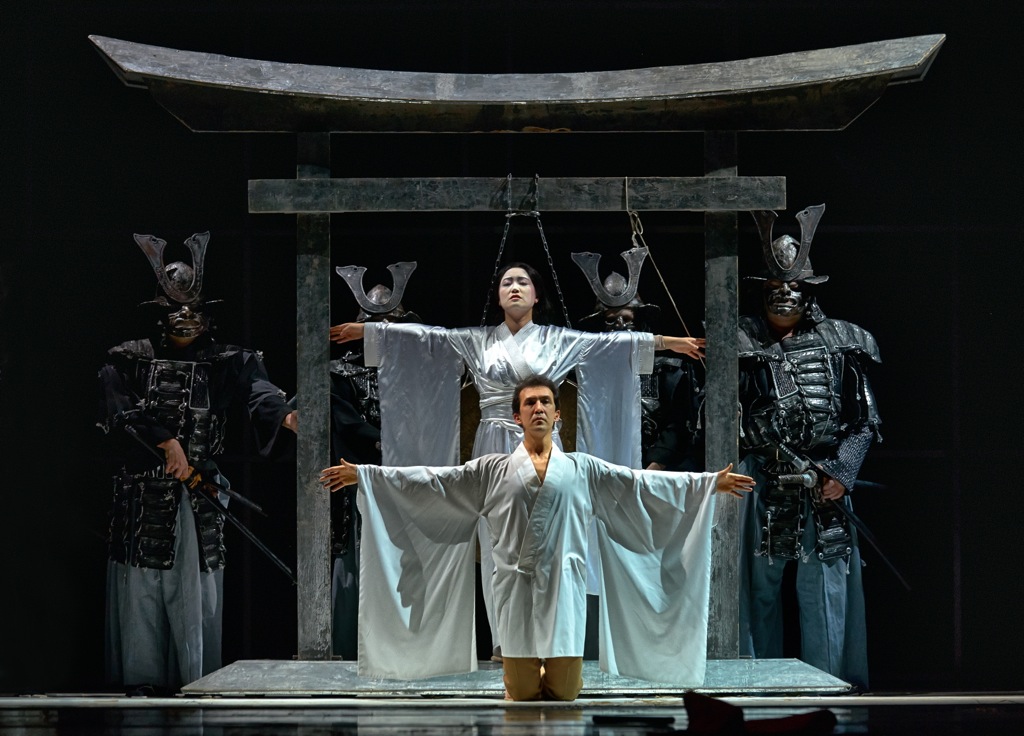 Здесь надо обозначить еще одну важную проблему — проблему маргинальности, столь болезненную для постимперского сознания и столь важную в геополитическом смысле не только для России, но и для всего мира. Половина человечества живет ныне не там, где родилась: смешение рас, великие переселения народов, проблема «чужих» и своих — все это уже было предсказано и отрефлексировано в опере Пуччини. По сюжету оперы родня отреклась и прокляла Баттерфляй из-за того, что она предала веру отцов. В спектакле героиня носит нарочито крупный крест на груди, быстро переодевается в европейское платье, завидев американского консула, пытается соблюсти европейский лоск, предлагая гостю сигареты. Она потерялась между двух культур, так и не смогла примирить в себе два диаметрально разных мировоззрения — и в этом ее личностная трагедия. Когда Баттерфляй убеждается в том, что брошена и предана, она срезает шнурок и отбрасывает крест прочь: самурайские ценности оказываются подлиннее европейских, а меч — надежней креста.