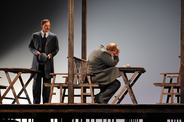 Режиссер Бычков и его напарник сценограф Эмиль Капелюш поместили все действо на железнодорожную станцию под названием «Вейцлар»: на протяжении оперы станционная платформа разворачивается из положения параллельного зеркалу сцены в перпендикулярное. Если отвлечься от содержания и оценить только сценографию как таковую, то ей не откажешь в изяществе и стильности, вниманию к деталям старинной обстановки. У художника, безусловно, есть вкус, сочетание цветов – очень выдержанное и уместное, с самого начала настраивающее на светлую, но все же трагедию. Тем не менее, в опере картинка не может существовать сама по себе – мы же не в художественной галерее. Она как-то должна сочетаться с действием музыкальной драмы. Итак, все происходит на пресловутой станции, грохочущий, проносящийся мимо поезд венчает финалы обоих актов (4-х-актный «Вертер» идет с одним антрактом), смерть главного героя показана как уход вполне реального человека «по шпалам, опять по шпалам» куда-то вдаль, видимо, в небытие (почти толстовская Анна Каренина). Почему так? Почему действие не происходит в аэропорту или на станции межгалактических перелетов? Только лишь потому, что их не было в 19 веке? Но, строго говоря, их не было и в 18-м, когда происходят события романа Гёте, равно как и железнодорожного сообщения. А то, что постановщики перенесли время действия произведения из эпохи Гёте в эпоху Массне (это видно и по «чеховским» костюмам персонажей), ничего не объясняет, ибо вполне можно было телепортировать «Вертера» и еще на пару столетий вперед. Глобальная метафора, скажете вы? Все мы здесь временно, все постоянно в пути – вот и ассоциация с поездом, с дорогой… Разумеется, гадать и домысливать можно сколь угодно долго – придумывать разные объяснения, одно правдоподобней / нелепей другого. Однако один вопрос все равно остается неразрешенным: почему драма Вертера на железнодорожной станции должна смотреться более жизненно, правдиво, душераздирающе, чем в доме отца Шарлотты или в каморке самого Вертера, как указано в либретто?