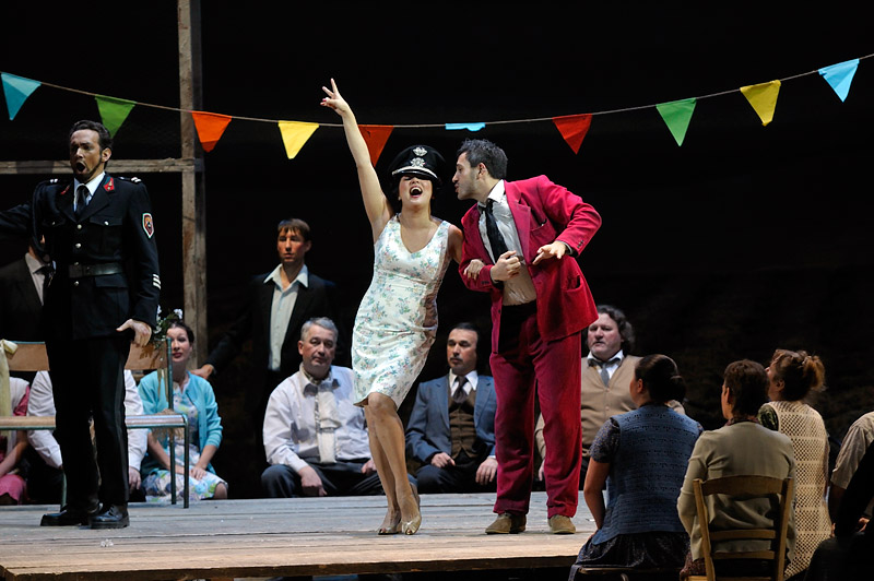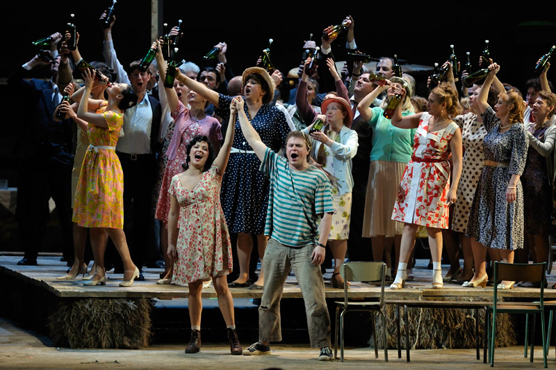 В завьюженном, заваленном снегом Питере постановка «Любовного напитка» с участием Анны Нетребко и Эрвина Шротта воспринималась как весть из другого, далекого мира: там светит солнце, голубеет небо и желтые пажити простираются до горизонта. Сплошная dolce vita: постановщик, французский режиссер Лоран Пелли вместе со своим постоянным сценографом Шанталь Тома сумели уловить, удержать и запечатлеть неуловимую эманацию радости жизни, которую ощущаешь в каждой частичке, каждой детали декора спектакля. Постановка, изначально предназначенная для Опера Бастий, начиная с 2007 года кочует по разным сценам мира: Париж, Лондон, Милан. Теперь вот еще и Санкт-Петербург.