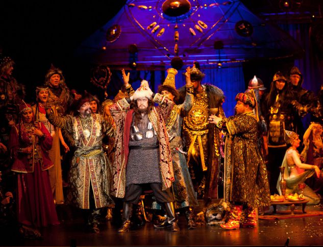 Здесь надо всё же отдать должное Вячеславу Окуневу: потрясающе лаконичная, но в то же время величественная сценография половецкого акта — это символические юрты с изумительной инкрустацией «драгоценных камней». Огромный постамент-трон с тремя массивными когтями в его основании, на котором вывозят впервые Кончака, смотрится невероятно эффектно, но обольщаешься — восторгаешься даже! — этим недолго: до того самого момента, когда начнутся «Половецкие пляски», точнее, как было уже сказано, не они сами, а заменяющая их пантомимная вакханалия.