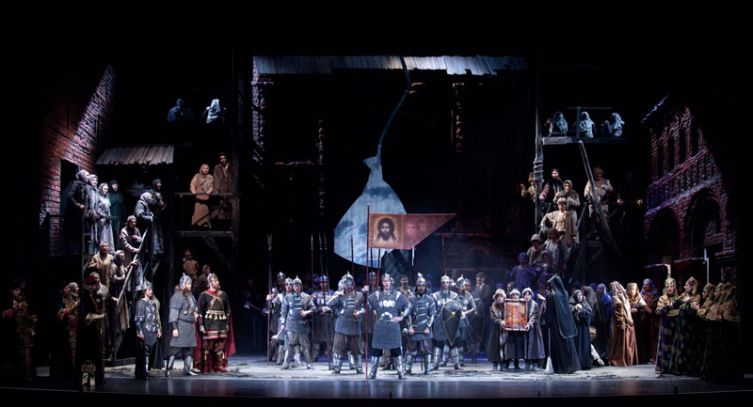 Но это еще не всё! Буквально «отбарабанив» свой финальный дуэт, Князь Игорь и Ярославна под печальный напев хора оказывается… на кладбище: последнее действие оперы происходит на фоне задника, изображающего мрачные небесные тучи, хористы стоят, словно надгробные памятники с фосфоресцирующими крестами на одеждах, а русская княжеская чета в финале незаметно «растворяется» в них.