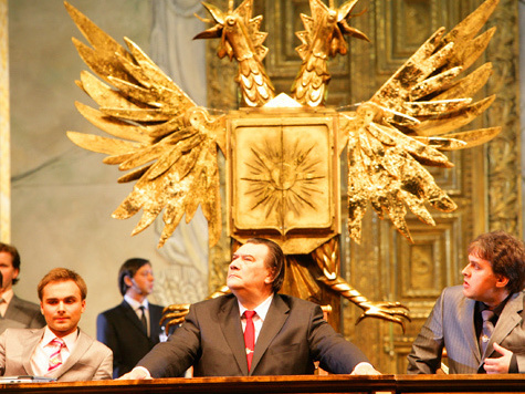 Взмах дирижёрской палочки — и на сцене начались стремительные темпы. Вышли уборщицы в технической одежде, они принялись шустрыми движениями смахивать пыль со столов, с петухов, лить воду на пол. Прошлись кинологи с немецкими овчарками. Где-то на крыше показались снайперы в камуфляже, с винтовками наперевес. Зал заполнила рота почетного караула Кремлевского полка. Высоко поднимая ногу, солдаты оттачивают шаг, размахивают красными знаменами с двуглавыми петухами. Появился скрюченный старикашка в цивильном костюме. Это — Звездочёт. Рабочий день, судя по всему, начался. В зал набежали вояки в форме, похожей на советскую, казаки с православными образами. Чиновники класса VIP выделялись акцентом на боярские одежды.