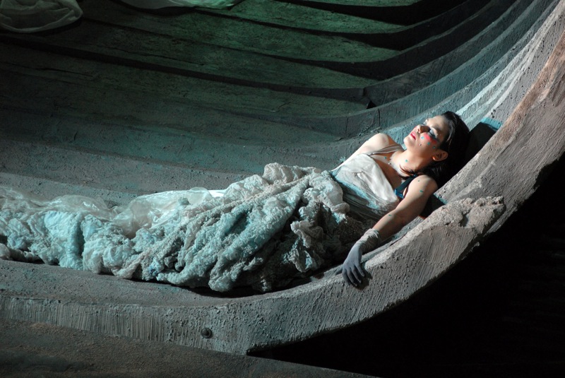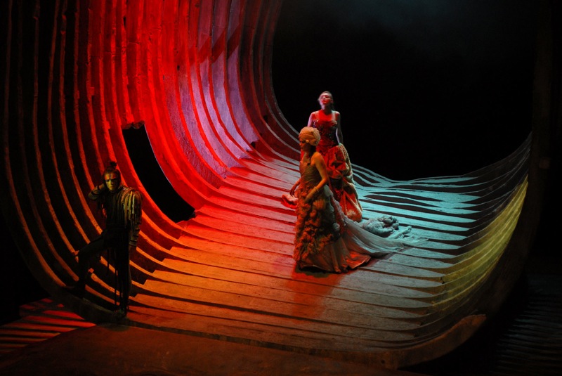Постановщики спектакля, казалось, поступили так, как не надо было бы поступать при постановке оперы барокко, но при этом эффект был достигнут поразительный! Спектакль приковывал к себе зрительское внимание не помпезностью перемен романтически живописных декораций, не постановочным размахом, не чудодейственной машинерией, а впрочем, на небольшой, поистине «камерной» сцене Teatro Verdi всего этого вряд ли и стоило ожидать. Постановка сочетала в себе несочетаемое – космически-философскую глубину камерного и достаточно скромного сценографического подхода, ни на мгновенье не ослабевающую психологическую пружину действия при его внешней вызывающе откровенной статуарности, правдивость и реалистическую убедительность в прорисовке характеров персонажей (как серьезных, так и комических), которым выпала непростая задача доказывать свою состоятельность в предложенном постановщиками абстрактном – едином на все три действия – театральном измерении. Если для сюжета барочной оперы Золотое руно явилось весьма привлекательным артефактом, то для «минимальной» (но при этом наиболее органичной) организации сценографического пространства соответствующим артефактом закономерно и мог стать лишь сам корабль «Арго», или, как в данном случае, его «призрак», покоящийся на кладбище умерших кораблей. Во всю ширину и высоту сцены водружен остов корабля в поперечном разрезе, наклоненный к зрителю и под небольшим углом повернутый к рампе таким образом, что на авансцене еще остается достаточно места для пролога и интермедии. Этот корабль-дом с «дверными проемами» и единственным «окном», выходящим в зрительный зал, исчерпывал всё, что представляло объемные декорации спектакля. На потемневшее от времени корабельное дерево был накинут огромный «белый саван» из легкого шелка. И не важно, в каком порту этот фрегат нашел свое последнее пристанище: в колхидском, иберийском или греческом… Важно, что «Арго» никогда уже больше не отправится в плавание, но на его «нетленных костях» еще могут оживать «дела давно минувших дней, преданья старины глубокой»…
