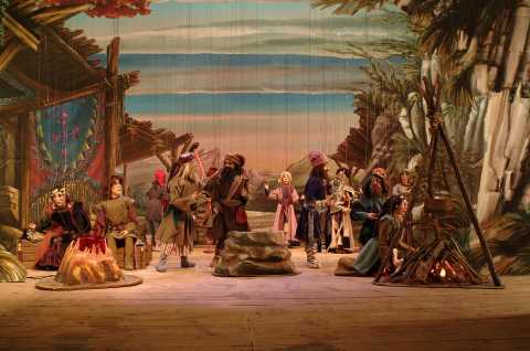На этот раз – снова опера, и снова Верди. Если «Аида» в 2005 году была изящной экзотической сказкой со счастливым финалом, в которой главные герои чудесным образом спасались, то в «Трубадуре», где страсти буквально «рвутся в клочья», а души страдающих персонажей «изранены в кровь», страдают и умирают даже марионетки. Популярнейший шедевр Верди на либретто Каммарано по пьесе Гутьерреса – запутанный детектив в чистом виде, так что связно рассказать его содержание постараться надо даже взрослому! И поэтому, несмотря на пояснение, что привезенный спектакль – «сценическая версия для детей и взрослых», он всё же гораздо в большей степени предназначен взрослым. А если и детям, то умеющим бегло читать синхронный перевод текста и хотя бы в общих чертах знакомым со спецификой оперного жанра. Спектакль частично идет под знаменитую историческую фонограмму 1957 года под управлением Герберта фон Караяна, а частично – под тексты для пения, которые, не поются, а декламируются. Раскладка «фонограммных вокальных сил» была следующая: Леонора – Мария Каллас; Манрико – Джузеппе ди Стефано; Граф ди Луна – Роландо Панераи; Азучена – Федора Барбьери; хор и оркестр миланского театра «Ла Скала». Как и в случае с «Аидой», которую мы видели шесть лет назад, постановку «Трубадура» в магическом и изысканном пространстве театра марионеток осуществил Карло Колла III, а над режиссерским воплощением и дизайном кукольных костюмов потрудился Эудженио Монти Колла. Все куклы и костюмы к спектаклю, изготовлены в собственной мастерской театра, а перед московскими показами в конце сентября – начале октября итальянские кукольники успели показать этот спектакль в Красноярске и Новосибирске.