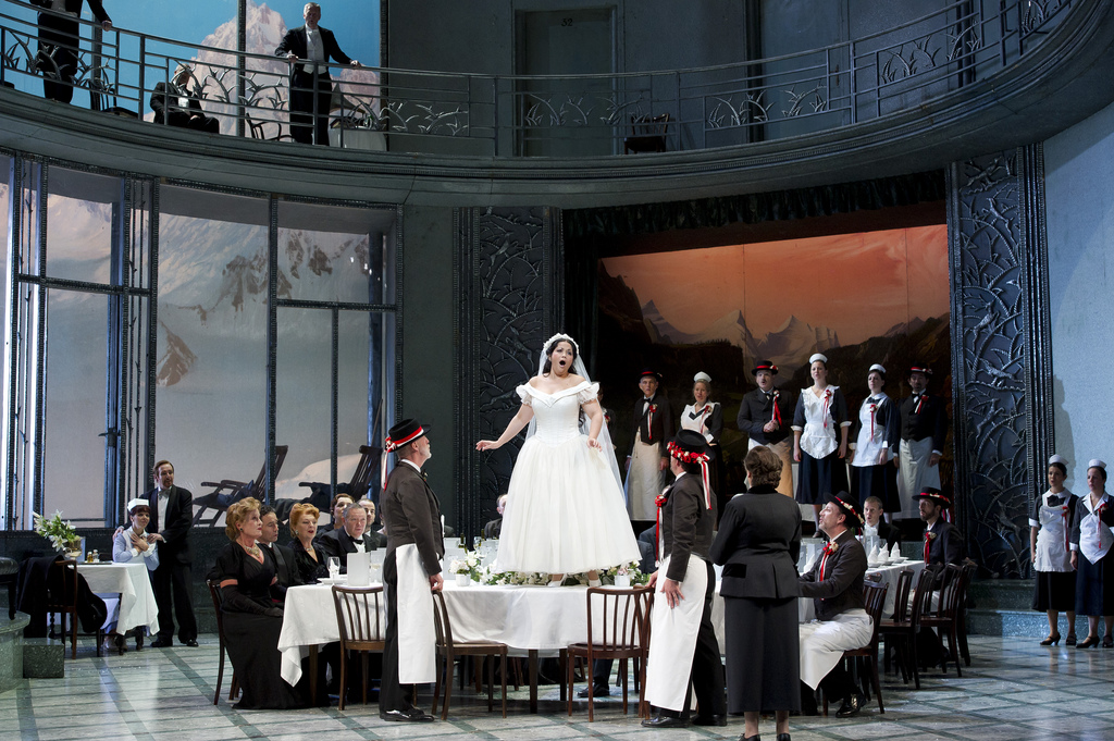 Постановка Марко Артуро Марелли, возобновленная Андреасом Ляйснером, переносит действие во времени (из неопределенных пейзанских далей в наши дни), но сохраняет либреттную локализацию – это по-прежнему Швейцария, хотя горная деревушка обернулась курортным местечком в Альпах, а поселяне превратились в обслуживающий персонал фешенебельного санатория, правда, имеющего некоторый отпечаток запущенности (потёки на стенах и круглой балюстраде бросаются в глаза сразу). Надуманность этого переноса не столь уж и велика – колорит места действия, социальные соотношения (богатый граф – простоватый народец) сохранены, ну а наряды Дагмар Нифинд-Марелли хотя и скроены по современным лекалам, не лишены изящества. Главная же героиня и вовсе большую часть оперы ходит в роскошном свадебном платье с кринолином – примерно таком же, как у Пасты 180 и у Каллас или Сазерленд 50 лет назад.