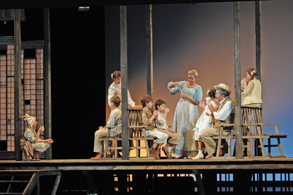 Спектакль Михаила Бычкова отличается театральным конструктивизмом оформления, предсказуемой, почти самодеятельной разводкой исполнителей и необъяснимой локализацией действия оперы Массне на каком-то полустанке с непонятным названием Vezlar (название немецкого городка, где происходит действие оперы, пишется, мягко говоря, не совсем так, как написано на табличке у сценографа спектакля Эмиля Капелюша). Вообще говоря, из всего наследия композитора, если не ошибаюсь, «Вертер» и драматургически, и интонационно одно из самых «чеховских» произведений (вроде ничего не происходит, но всем отчего-то грустно и тягостно и хочется на свежий воздух), и в этой связи перенос постановщиком действия более чем на 100 лет вперёд кажется весьма уместным (особенно хороши кремовые костюмы, дагеротипная монохромность которых прекрасно ложится на импрессионистскую стилистику интонационно хрупкого шедевра Массне). Но это лишь теоретически.