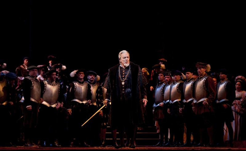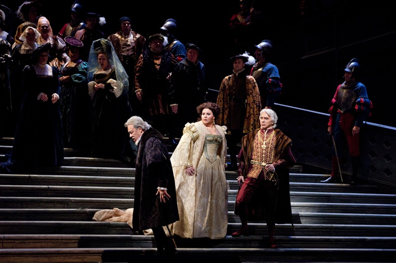 Во-вторых, спектаклем, с которым нам предстояло встретиться на экране, анонсировалась знаменитая — теперь, наверное, уже можно сказать — историческая постановка 1983 года Пьера-Луиджи Самаритани, за пультом которой стоял незабвенный Джеймс Левайн, а в главных партиях выступили недосягаемый Лучано Паваротти (Эрнани), Леона Митчелл (Эльвира), Шеррилл Милнз (Дон Карлос) и Руджеро Раймонди (Дон Рюи Гомес де Сильва). По счастью, этот спектакль в свое время был записан на видео — и сегодня в коллекции каждого уважающего себя меломана DVD c его записью является практически «обязательной» единицей хранения. Это сразу же исключает необходимость говорить в наших заметках о самóй постановке: она просто великолепна! Достаточно заметить лишь то, что «тяжеловесная традиционность» ее объемного монументального реквизита невероятно пронзительно заставляет почувствовать как саму атмосферу мрачного Средневековья, так и в высшей степени романтический антураж кровавой драмы.