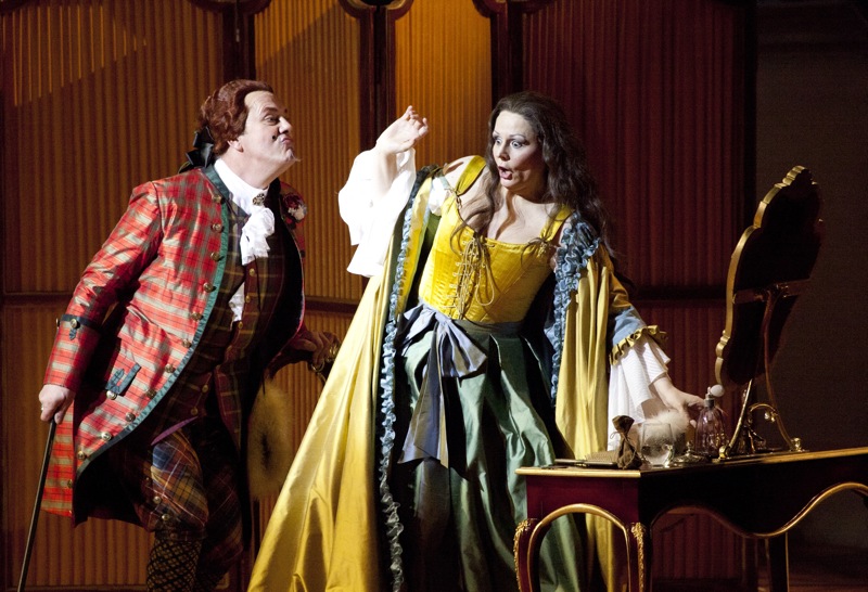 Нарядность более двухсот костюмов не аляповата и не криклива, несмотря на свою пародийность, а иллюстративный диалог цветовых решений местами просто завораживает: так, в первом акте синий мундир Октавиана перекликается с синим кринолином Маршальши, а во втором — серебряный камзол Октавиана — с серебряным платьем Софи. Серебром отливает и строгое платье Маршальши во второй части третьего акта — как увядшая серебряная роза, она исчезает вместе с отцом Софи не то в дверном, не то в оконном проёме (интерьерная незатейливость сценографии Бенуа Дугардина, в которой использованы не только известные фрагменты декора знаменитого Отто Вагнера, но и оформительские идеи Юргена Розе к постановке Отто Шенка в Баварской государственной опере, поражает воображение своей функциональной насыщенностью).