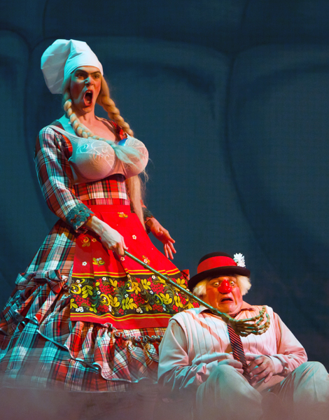 Зато к мужским голосам придраться было практически невозможно. Андрей Решетников в роли Короля Треф порадовал обертоновым богатством своего баса, Ильгам Валиев – корректной фразировкой и убедительной игрой в абсолютно идиотической роли Принца. Так же хороши были Александр Кульга в роли Леандра и акробатически фееричный Владимир Ворошнин в роли Труффальдино: у обоих драматическая органичность прекрасно сочетались с тембровой чистотой и качеством звуковедения. Тонкой карикатурностью и шикарными нижними нотами раскрасил роль Кухарки - единственного персонажа, вызывающего во всем этом прокофьевском балагане настоящую симпатию, — Александр Колесников.