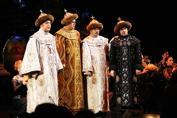 Конечно, это был не гала-концерт во фраках, его от геликоновцев, собственно, никто и не думал ожидать, хотя начало – с блестящей увертюры Глинки к опере «Руслан и Людмила» было вполне конвенциональным. Налет сюра и абсурда в сценографии, бессчетные шапки Мономаха из «Бориса Годунова», грандиозные яйца Фаберже из «Распутина», «самый движущийся в Москве» хор «Геликон-оперы» в вечерних нарядах, четыре царя Бориса и два доктора Бартоло, один другого краше, величие классики с колоколами и позументом на костюмах, и рука об руку с ней отвязная современность...