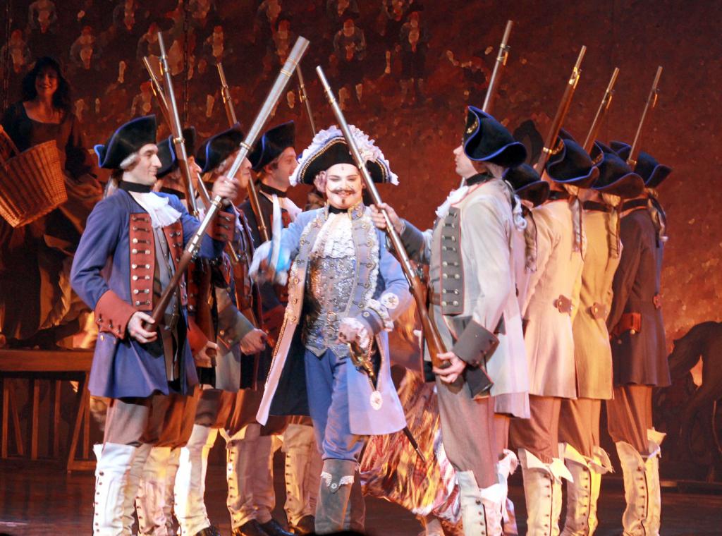 Кроме того, очень слабое звено постановки – костюмы (что категорически недопустимо для коммерческого шоу, у которого немалая часть аудитории – гламурные барышни, решившие выгулять в свет новое платье). Всякий раз, когда задумка выходила за пределы строгого, в духе первого фильма 50-х годов, следования историческому костюму, получалось плохо (а когда не выходила – получалось, опять же, скучновато). Цыганку Аделину нарядили в тяжелый балахон в холодных бирюзово-фиолетовых тонах, более приличествующий какой-нибудь дочке водяного на детском утреннике, нежели жизнелюбивой полковой маркитантке в гусарской комедии. Еще более неоновый сине-фиолетовый цвет обосновался на пионерских юбках-колокольчиках у канкана, изредка он сменялся не менее неоновыми пластмассовыми юбками-каркасами. А несчастную маркизу де Помпадур и вовсе обрекли провести значительную часть спектакля и спеть блестящую арию в нелепых панталонах, никаким парижским шиком не отличающихся.