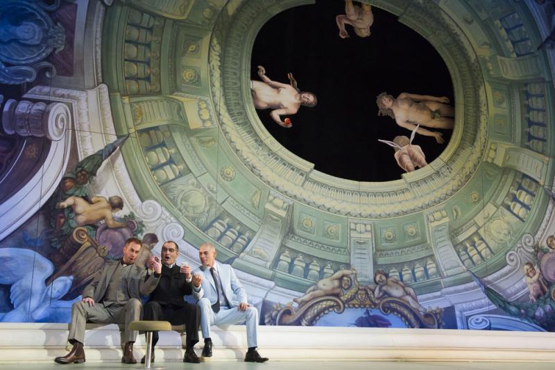 Более того, по своему костюмно-сценографическому облику постановка предстает весьма «минималистичной», но это вовсе не костюмированный концерт, а очень тонкое, изысканно выстроенное театральное действо. Нити его, вообще-то говоря, явно зловещей интриги находятся в руках этакого Мефистофеля, выведенного под именем Дона Альфонсо, хитрого и коварного «ловца человеческих душ», и его резвой «сообщницы» Деспины, напротив, полной жизни и доброго искреннего света, похоже, до конца так и не понимающей, во что ее втянули все эти «происки от лукавого» (одно дело «невинный» флирт с кем-то в отсутствии мужей, другое дело – перекрестная измена со своими же неузнанными мужьями). Пари между Доном Альфонсо и Гульельмо с Феррандо, которое должно опровергнуть или доказать супружескую верность Фьордилиджи и Дорабеллы, в интродукции оперы заключается на фоне живописной картины, рама которой вписана в высотные и широтные габариты сцены. Изображение картины в искривленной перспективе олицетворяет тот самый «oculus», то самое «око Дьявола», через которое на «пантеон человечества», нарушая привычный круг жизни, исходят всевозможные искушения.