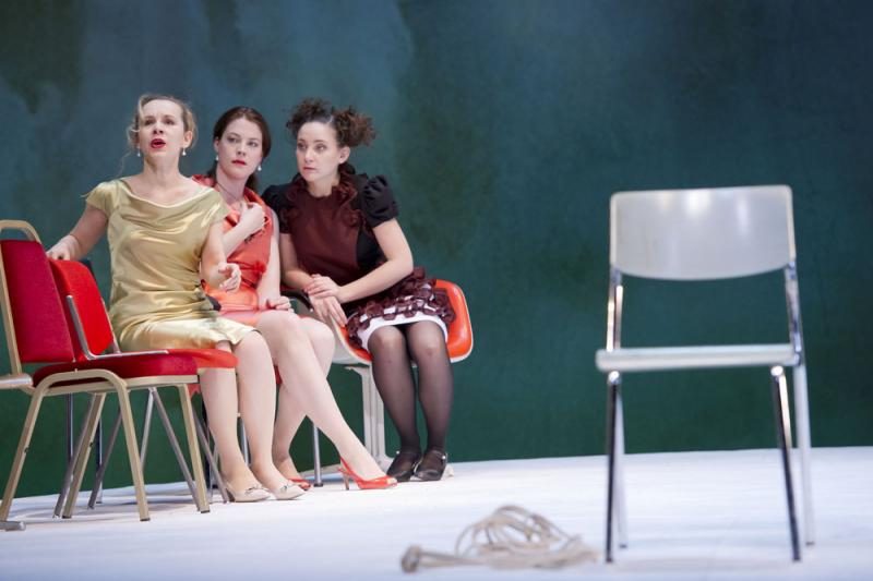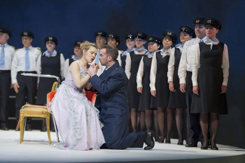 Итак, постановка немецкого режиссера Даниэля Каразека (вообще, вся постановочная команда – немецкая) – это современное музыкальное пособие, написанное языком эстетической театральной красоты, заключенной в обыденно простых вещах. В спектакле нет ни театральной мебели, ни масштабных сценографических выгородок: в нем есть удивительно притягательная атмосфера простых и бесхитростных костюмов, на первый взгляд абсолютно стирающих грань между сценой и реальностью нашего времени, но эта атмосфера вовсе не банальная копия нашей жизни. За счет очень мягкой игры в современные аллюзии, за счет действенно психологических мизансцен, наконец, за счет потрясающих актерских воплощений эта постановка в вопросе преломления и проецирования эпох друг на друга явно находит золотую середину. По счастью, в ней нет никакой агрессии, никакого натурализма и прочих постмодернистских выкрутасов, к которым повышенное тяготение в наши дни испытывает именно немецкая режиссура.