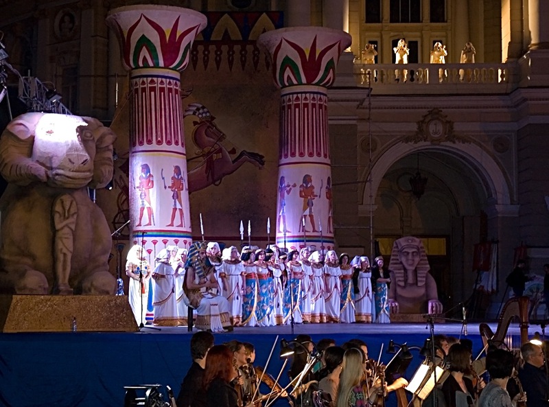 Как бы то ни было, на место центрального события фестиваля с самого начала номинировалась премьера на пленэре вердиевской «Аиды» в постановке итальянского режиссёра Карло Антонио де Лючия. Если абстрагироваться от технических проблем, сопровождавших звуковую трансляцию спектакля (надеюсь, администрация Одесской оперы не оставит без судебных последствий столь серьёзный брак в оказании услуг компанией, приглашенной для организации акустического сопровождения открытия фестиваля), то, прежде всего, стоит отметить постановочную добротность, мизансценную простоту и стилистическую корректность предложенного режиссёром прочтения. С одной стороны, предсказуемая разводка артистов возлагала на последних титаническую работу по созданию артистической убедительности озвучиваемых образов, а, с другой, — именно традиционная прозрачность режиссёрского высказывания, в своей интерпретации не сильно далеко отошедшего от концертно-костюмированного представления известного сюжета о любви, которая сильнее смерти, позволила певцам максимально продемонстрировать свои способности, даже несмотря на некачественную звукопередачу.
