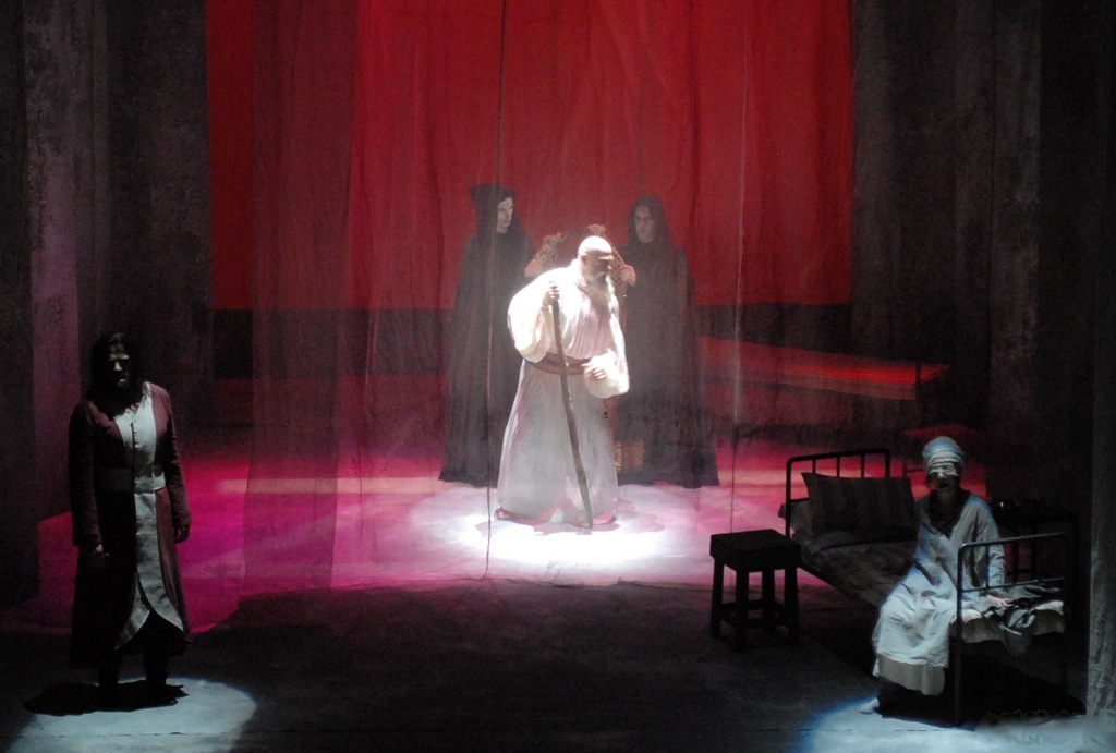 Мистическую пару, замыкающую шестерку главных персонажей, исполняют два замечательных итальянских певца: баритон Паоло Кони (Монах) и Давид Сотжу (Рыцарь). В отличие от партий Женщины и Волонтера, в которых, определенно, «есть, что попеть», вокальные портреты Монаха и Рыцаря основаны на очень выразительной, подчеркнуто яркой мелодекламации — и мастерство как маститого баритона, так и еще достаточно молодого тенора делают эти образы весьма значительными и психологически притягательными.