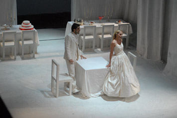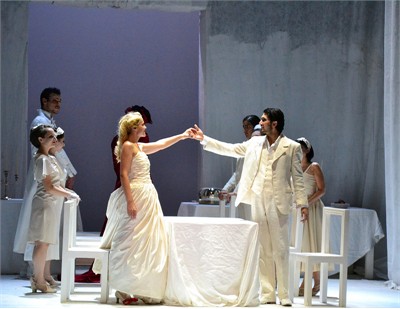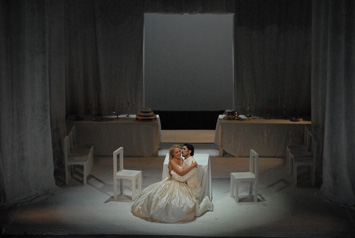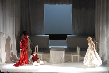 Перед нами — постановка типично западноевропейского толка, тяготеющая к постмодернистской эстетике музыкального театра: ничего «реально мифологического» в ней нет, зато «реальность абстракции» навевает мысли о достаточно добротной, неагрессивно мягкой студийности. Лишь столы, стулья и легкие ткани-трансформеры (всё в белой гамме), непрерывно переставляемые и перемещаемые по сцене самими участниками постановки, и создают среду обитания этого белого спектакля, ведь и все его персонажи одеты в белые одежды — костюмы современного покроя. Единственное красное пятно в этой истории — платье Венеры, на этот раз травестийного персонажа: эта партия поручена тенору (баритенору), что еще больше усиливает гротеск ситуации, даже привносит легкий, дозированный оттенок эпатажной иронии. Вообще, как ни странно, именно Венера предстает самым ярким и запоминающимся персонажем этой постановки!
