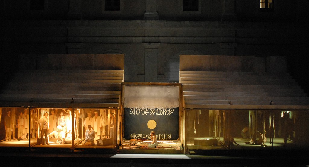 но всё же вполне функциональны и добротны в том смысле, что испортить музыкальный праздник меломану они просто не в состоянии. Дворец Артаксеркса в древних Сузах — конструкция из набора песочно-«золотых» панелей с дверными проемами и перегородками, легко трансформируемыми относительно друг друга, а дворец Оросмана в Иерусалиме — и вовсе огромная «фанерная» коробка с лесенками на «крыше» (иногда стены этой коробки становятся «прозрачными»), так что действие происходит на двух уровнях: наверху — вельможные покои и гарем, внизу — казематы для французских пленников…