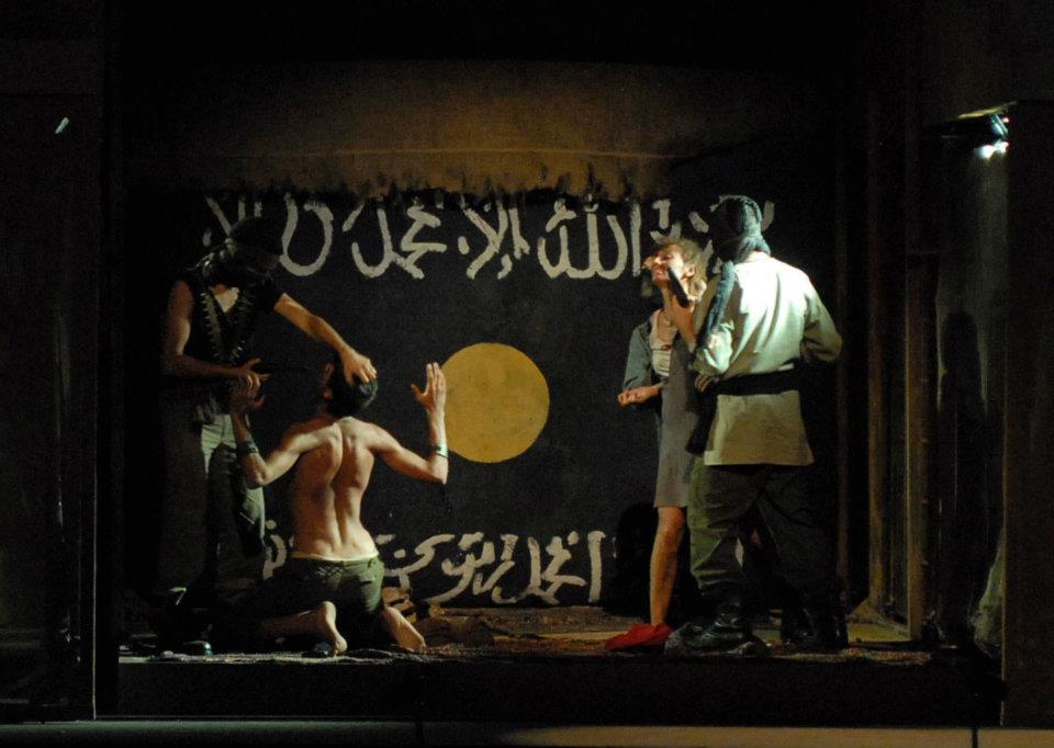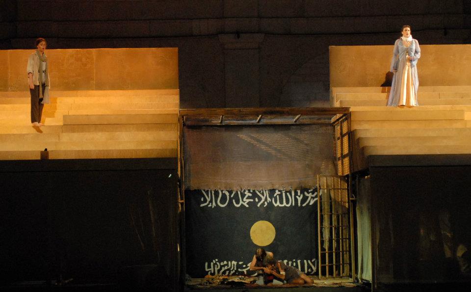 Это даже «режиссерской оперой» трудно назвать, настолько безвкусно, убого и пóшло то, что предстает взору на нижнем плане в центре придуманной «сценографической коробки». Какая-то «исламистско-шахидская» группировка в камуфляже и с оружием не только охраняет этот гарем-дворец, но и истязает его узников — да вот хотя бы парочку «туристов-журналистов», вылавливаемых в начале спектакля: с ними на переднем зрительском плане и проделываются все показательные «пластические экзерсисы-мордобои». Один боевик из этой группировки — явно садист с ненормальной психикой, и цель его не только причинить боль европейской заложнице, но и растоптать, морально унизить. Для нее всё заканчивается одновременно с роковым ударом кинжала, предназначенным Заире… Ах, если бы только было возможно всё это параллельное, отвлекающее от музыки действо на нижнем плане убрать, а всё остальное и наверху, и внизу оставить, как есть, то мог бы получиться неплохой спектакль, ведь весь его верхний костюмно-романтический план в плане режиссерской проработки выглядит вполне разумно…