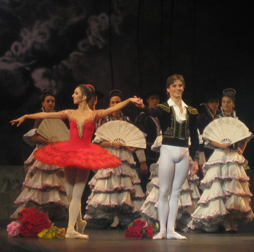 Ему удавались сверхсложные по технике вещи: например, каскад вращений по кругу (перемежая жете ан турнан с со де басками и лакируя их пируэтами), двойные воздушные туры под наклоном, безусильные поддержки немаленькой балерины, доставшейся ему в партнерши, на одной руке. И это при том, что танцовщик ростом не высок и конституции не атлетической. И все это запросто, без акцентирования на том, как это сложно. Наоборот, легко, сохраняя эталонные позиции, аккуратные стопы, красоту поз, элегантность, все то, что называется культурой и эстетикой танца. Демонстрируя графичность, заимствованную хореографами балета в фольклорной традиции испанских цыган — стиле фламенко.