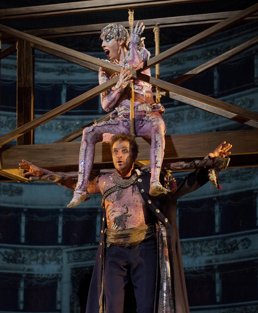 Впрочем, то же самое лукавство прослеживается, и когда в «Буре» Адеса вдруг находят несуществующие отголоски «Волшебной флейты» Моцарта, и когда сопрановую партию Ариэля с ее ультразвуковой «стратосферной» тесситурой сравнивают с партией Царицы ночи, и когда, наконец, самого Адеса ставят равновеликим Бриттену. Тоже самое лукавство прослеживается, когда режиссер и сценограф, ухватившись за миланское герцогское происхождение Просперо, его владения на его острове банально отождествляют со зрительным залом театра «Ла Скала», а Ариэль по приказу Просперо водит и рассеивает спасшихся после кораблекрушения персонажей по кулисам этого театра, пока не приводит их всех через сцену в зрительный зал… Убогой сценографией растиражированного декора своего занавеса театр «Ла Скала» уже успел набить нам оскомину «Дон Жуаном» в сентябре. Теперь и «Meт» – тоже! Сговорились они что ли?..