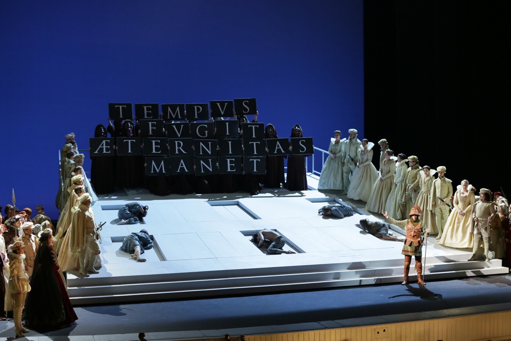 Декорации разочаровали: скучный прямоугольник с прорезями окон — в первом акте, банальная наклонная платформа — в третьем. Из люков появляются осужденные, и снова исчезают. Костра нет — лишь белый дымок курится на заднем плане. На полупрозрачных завесах мелькает смутное видео; белесые фигуры, символизирующие души сгоревших заживо, улетают ввысь.